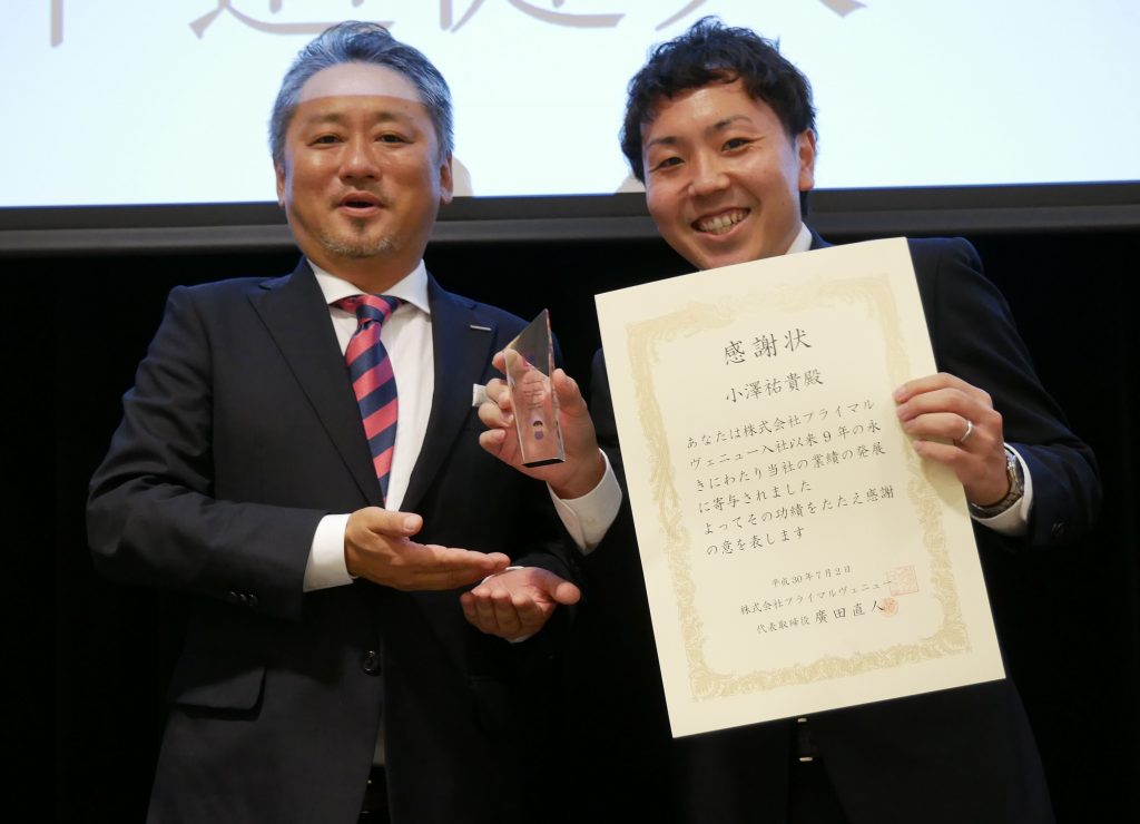 会議で部員たちの近況報告を受ける小澤(中央)。 部員それぞれが持つ案件の進捗状況はもちろん、数字の推移、労務管理など、部長には考えることが沢山! それでも、部員たちの活躍はリーダーにとって何よりの喜びでもあります。 いつも熱くポジティブに仕事を楽しむ姿勢が、社内全体を明るく照らしています。 2009年に新卒で入社して、勤続10年を表彰! これからの活躍にも期待しています!