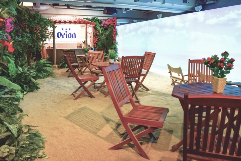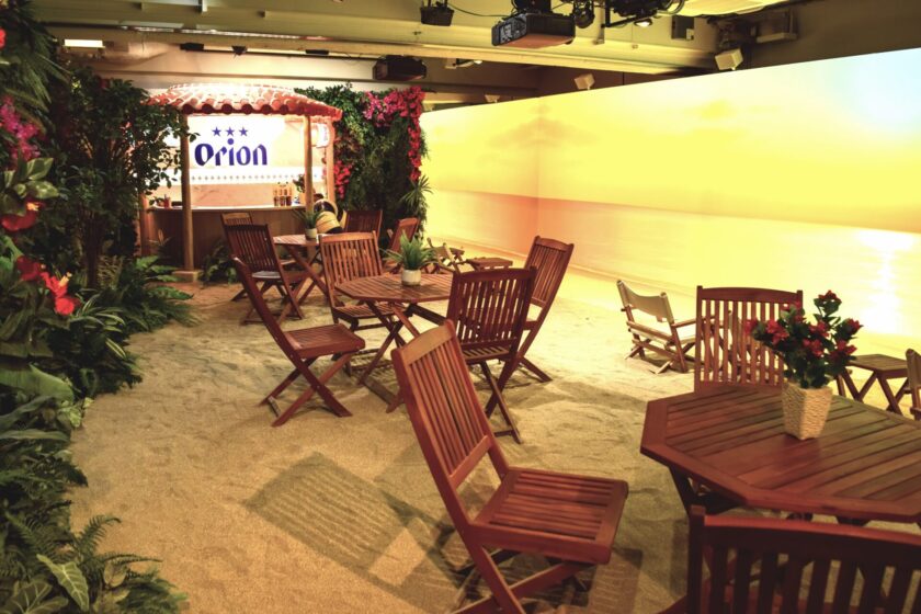 沖縄・宮古島のビーチを再現した空間で、オリオンビールを無料提供したサンプリングイベント。プロジェクションマッピングによる海の投影や、植栽・砂の空間装飾により、リアルな砂浜を再現。当社は、企画・施工・沖縄出身キャスト手配・運営・機材手配等を担当。